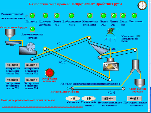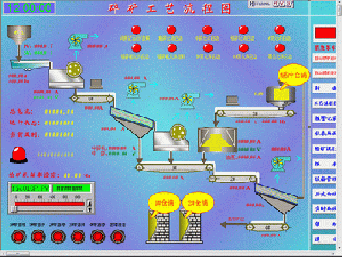 該系統采用工業計算機為主機,與下位機PLC、智能儀表、變頻器等通訊,采集各設備的運行狀態、運行電壓、電流,下置設定數據,主機內置10/100M網卡與廠區局域網連接,局域網上的其他授權工作站可方便的瀏覽生產情況,便于領導隨時監督指導生產。下位機采用三菱PLC進行邏輯關系處理,用智能數顯電壓電流表采集電壓、電流,智能數顯控制儀完成閉環控制,用核子秤檢測給礦量,用稱重儀表檢測緩沖倉中的礦石量,用富士變頻器控制給礦機和皮帶的運行頻率,以滿足運行要求,用ABB軟啟動器啟動大功率設備。該控制系統分為設備自動順序連鎖起??刂坪椭悄馨葱杞o礦控制兩大部分。