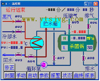 Product classification食品殺菌鍋的殺菌工藝主要分升溫、恒溫和降溫三個階段。采用觸摸屏與PLC控制相關氣動閥門、水泵等設備,實現食品殺菌的自動完成。在觸摸屏里編制不同食品的殺菌配方,下置配方給PLC,PLC即按照選定的配方自動完成殺菌工作。PLC程序里含有溫度與壓力的自動換算程序,殺菌鍋里的設定壓力隨鍋內溫度的變化而自動變化,以保證被殺菌罐頭內的壓力與殺菌鍋內的壓力基本平衡,避免罐頭變形或爆裂。該設備已成功應用了多套,在多家食品廠內使用。